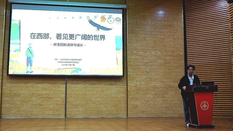为引导学子树立服务基层的青春志向,感悟奉献担当的成长价值,12月11日,校团委在启林南思政体验馆一楼学术报告厅举办“攀登者说”系列分享会第二期。本次活动特邀我校第一届研究生支教团成员、2025级水利工程专业硕士邹毅同学,他紧扣“看见”这一核心主题,生动讲述了参与西部计划“研支团”的选择初心与成长历程。