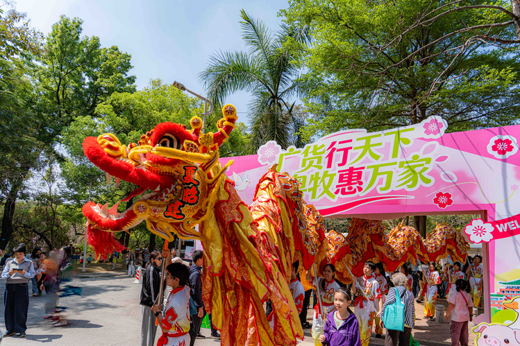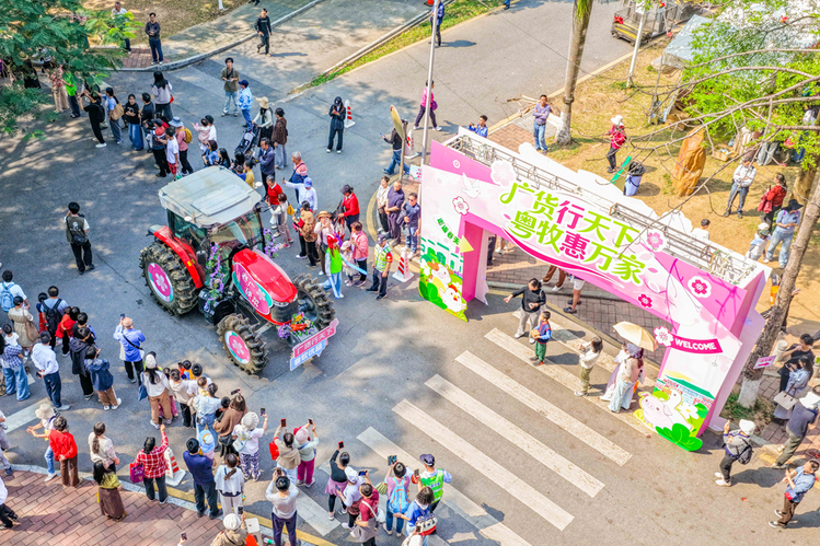 当天,“广货行天下·粤牧优品”文明集市继续在竹铭草海火热开市。全省21地市优质畜牧农产品“一站式打卡”,美食品鉴、产销对接等活动应接不暇,搭建校地联动、助农促消费的优质平台,人流涌动,热闹非凡。巡游过程中,不仅智能农机花车专设“广货行天下”主题装饰,龙狮队还特地前来互动,活泼灵动的模样十分吸睛。