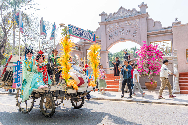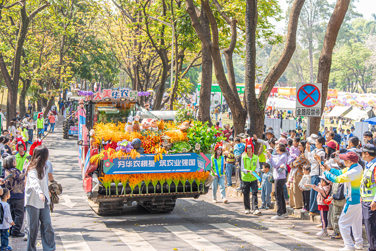 随着稻穗烟花升空绽放,科技文化巡游拉开帷幕。队伍从行政楼广场出发,途经农林讲习所门楼、竹铭草海、华山学生活动中心,最终抵达校史馆,一路繁花相伴,亮点纷呈。其中,智能农机主题花车组成的科技方阵格外亮眼,车身以节水抗旱稻、荔枝、蓝莓、蛋鸡、紫金蝉茶等华农主导研发的农产品精心装扮,集中展示学校服务“粤强农芯”“粤强农装”“粤强智农”的农业科技创新实力。