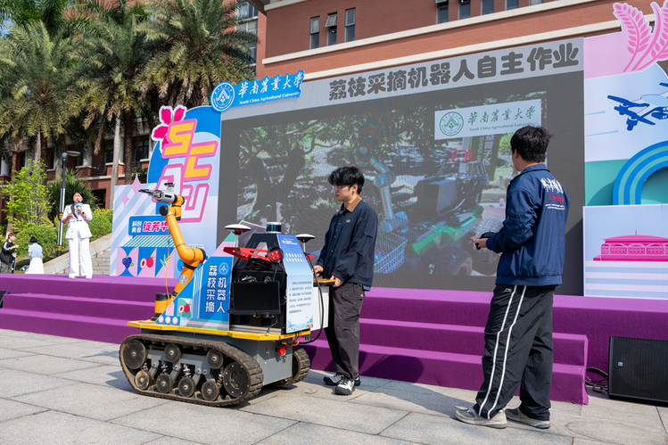 科技成果路演环节,师生代表把实验室硬核技术搬到现场,生动讲解节水抗旱稻、荔枝智能采摘机器人、抗禽白血病中国黄鸡等产学研融合成果,直观展现华农服务“百千万工程”的扎实成效。